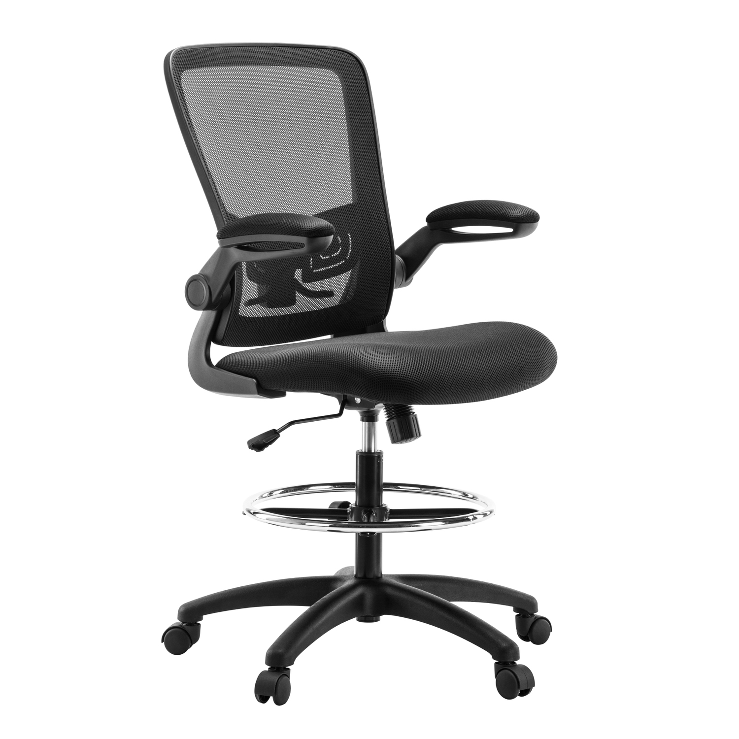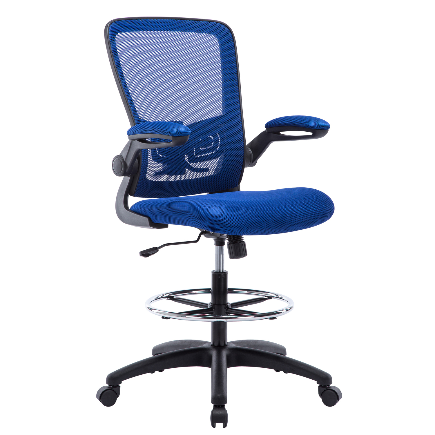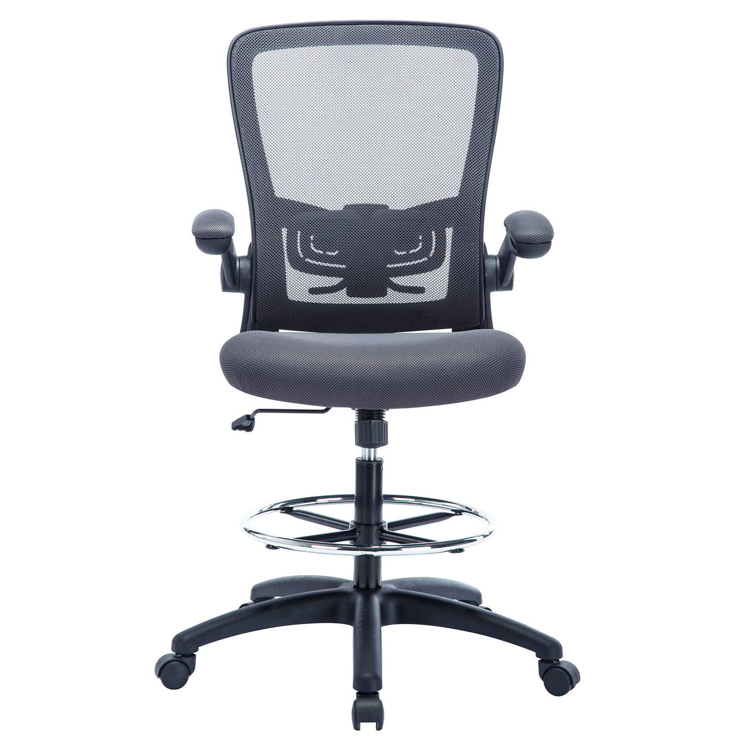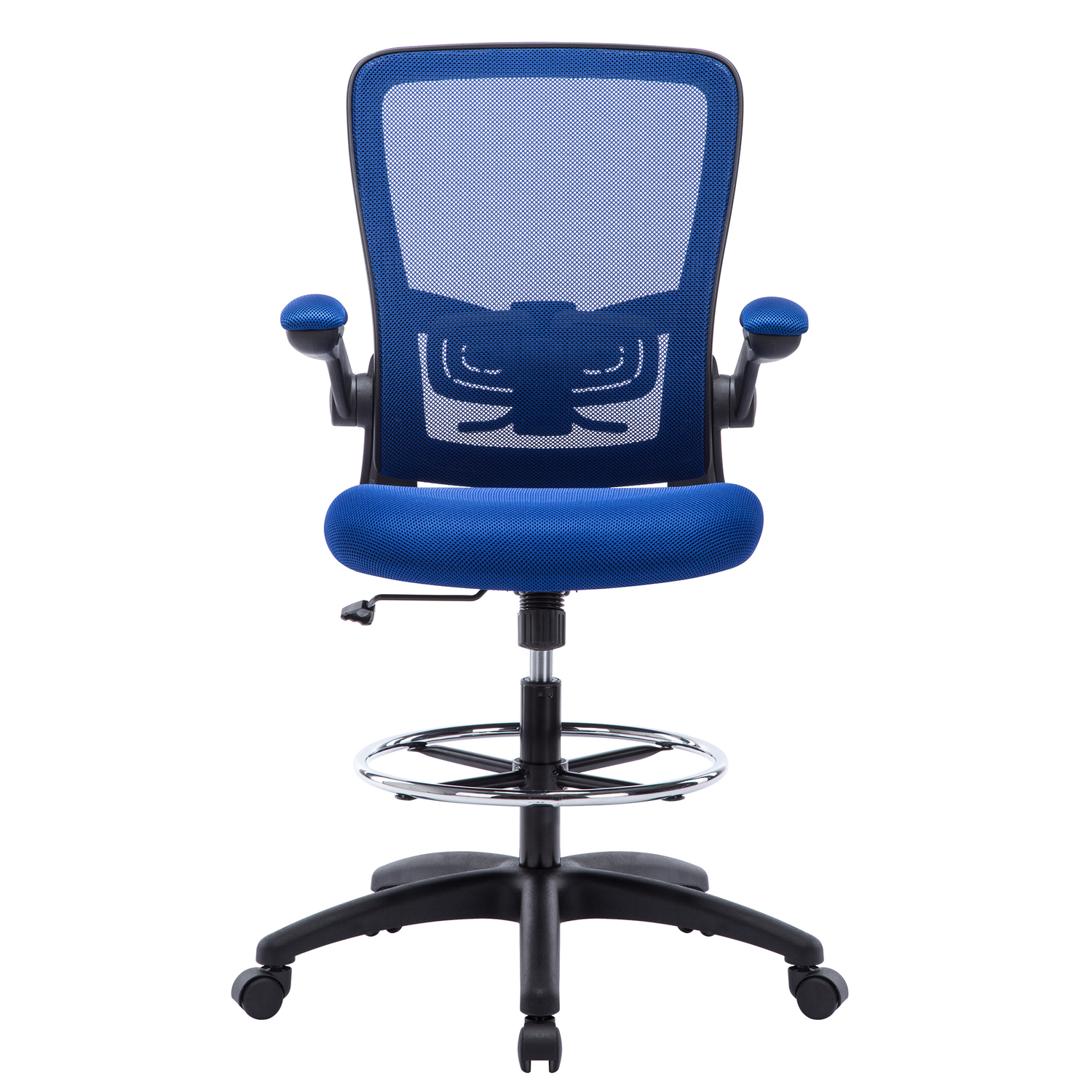 Add this Homestock high back office chair to your workspace. Great for those who sit for extended periods of time, built-in lumbar support follows the natural curve of your spine and relieves pressure on your lower back, reducing back pain. An adjustable height and flip-up armrests let you customize the placement for better shoulder and neck support, and an adjustable foot ring helps reduce pressure on your legs and improve circulation. A breathable mesh back brings more comfort. For easy moving, it comes with twin smooth-rolling wheels. Backed by a 90-day manufacturer’s warranty.