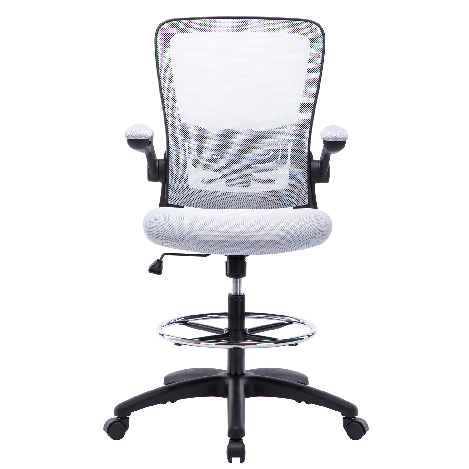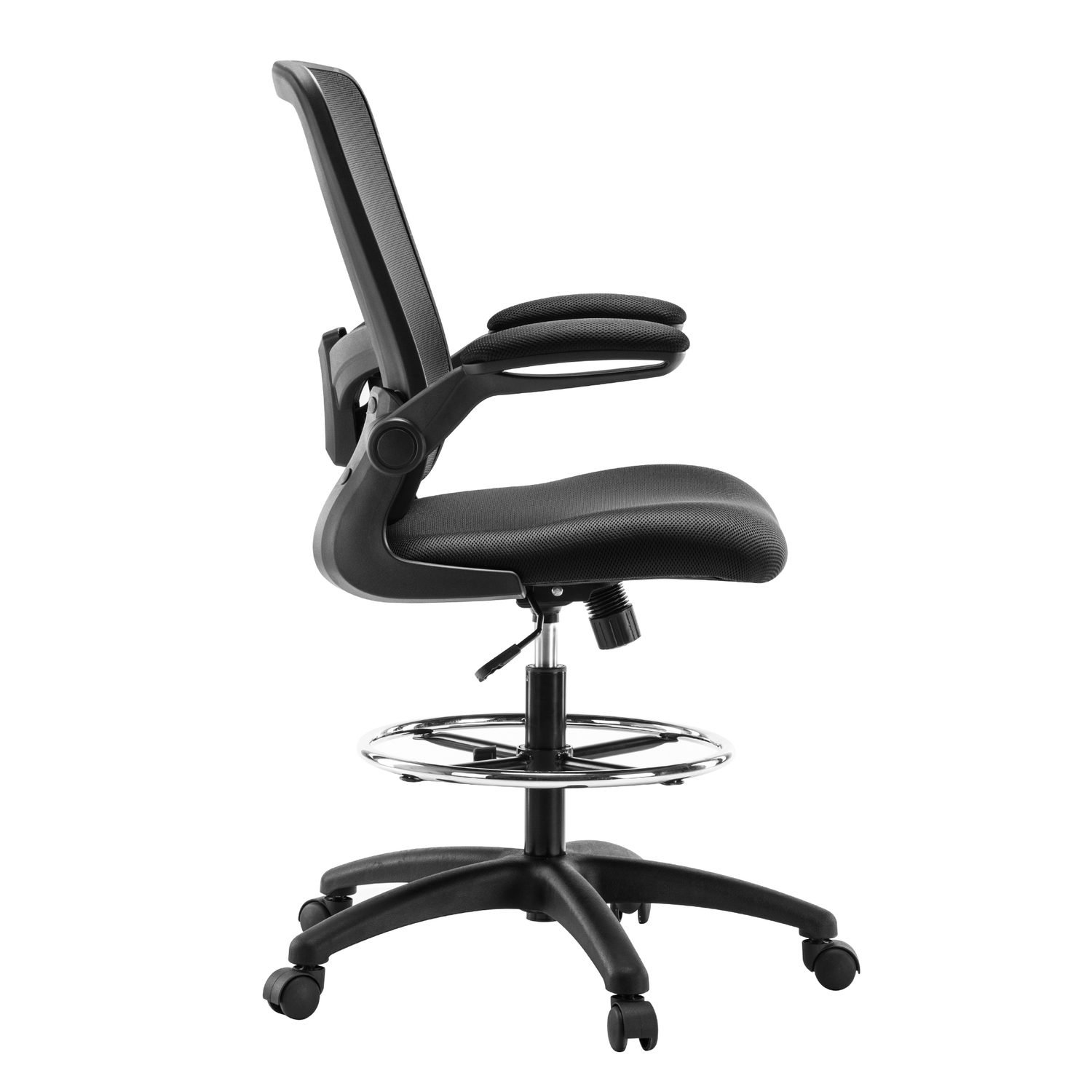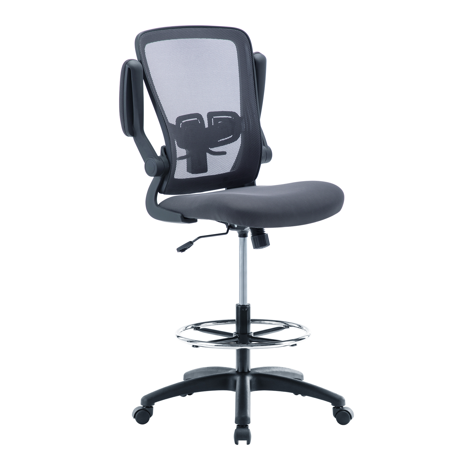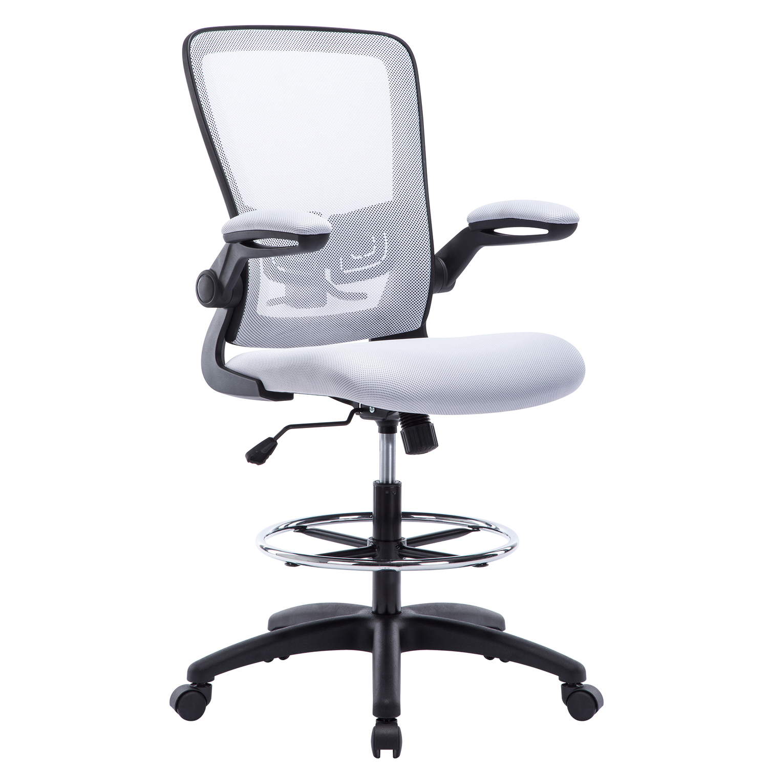 Add this Homestock high back office chair to your workspace. Great for those who sit for extended periods of time, built-in lumbar support follows the natural curve of your spine and relieves pressure on your lower back, reducing back pain. An adjustable height and flip-up armrests let you customize the placement for better shoulder and neck support, and an adjustable foot ring helps reduce pressure on your legs and improve circulation. A breathable mesh back brings more comfort. For easy moving, it comes with twin smooth-rolling wheels. Backed by a 90-day manufacturer’s warranty.