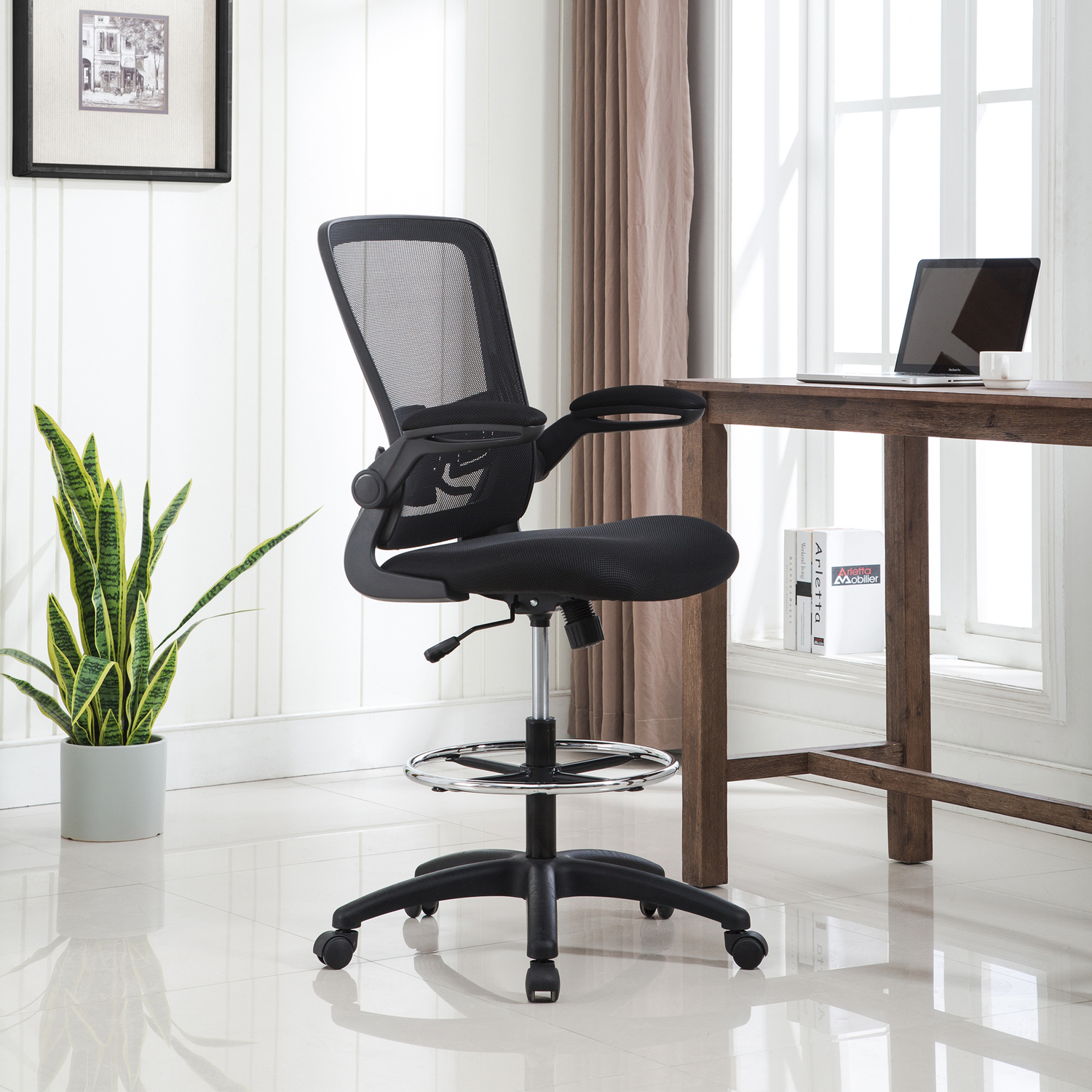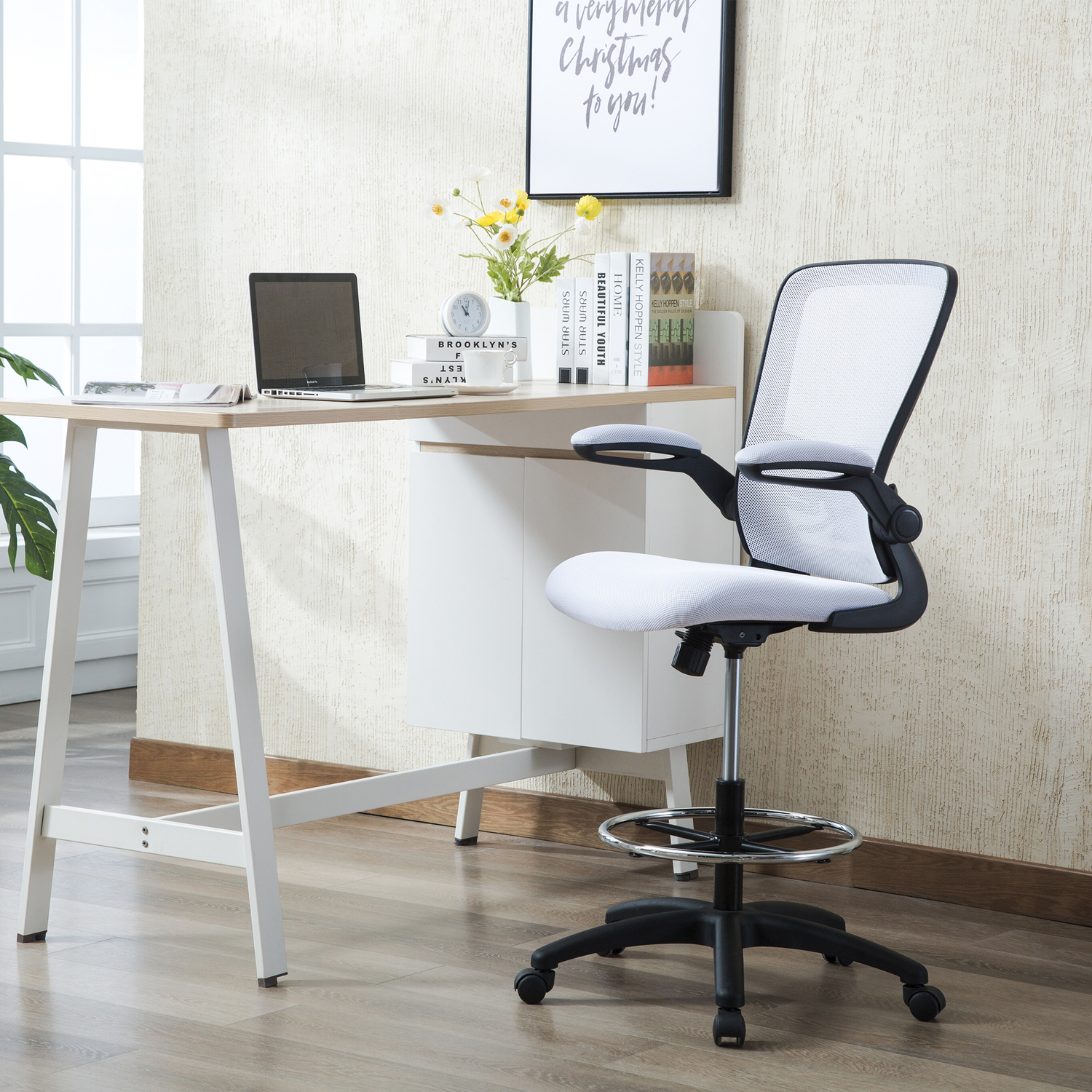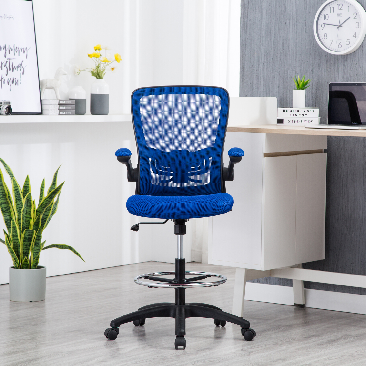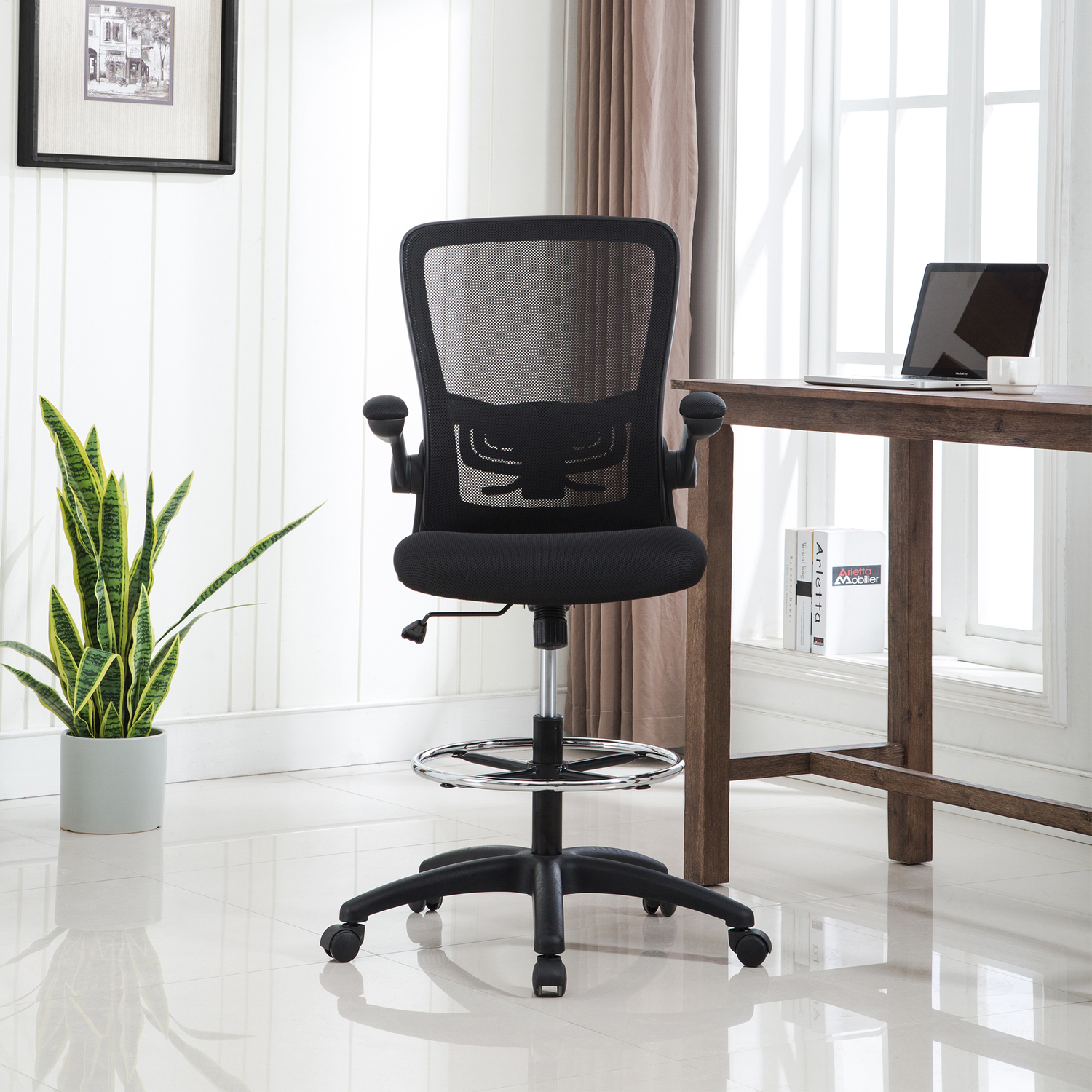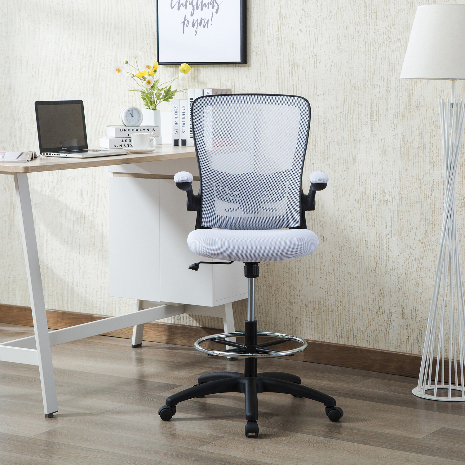Add this Homestock high back office chair to your workspace. Great for those who sit for extended periods of time, built-in lumbar support follows the natural curve of your spine and relieves pressure on your lower back, reducing back pain. An adjustable height and flip-up armrests let you customize the placement for better shoulder and neck support, and an adjustable foot ring helps reduce pressure on your legs and improve circulation. A breathable mesh back brings more comfort. For easy moving, it comes with twin smooth-rolling wheels. Backed by a 90-day manufacturer’s warranty.