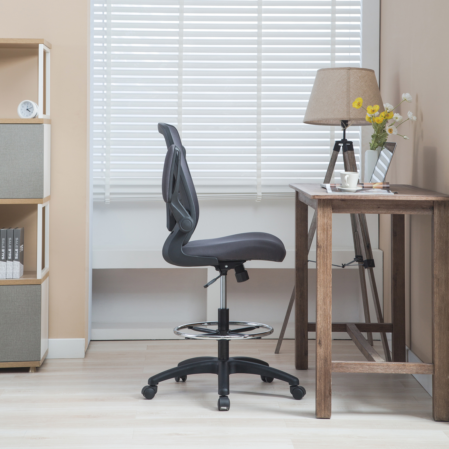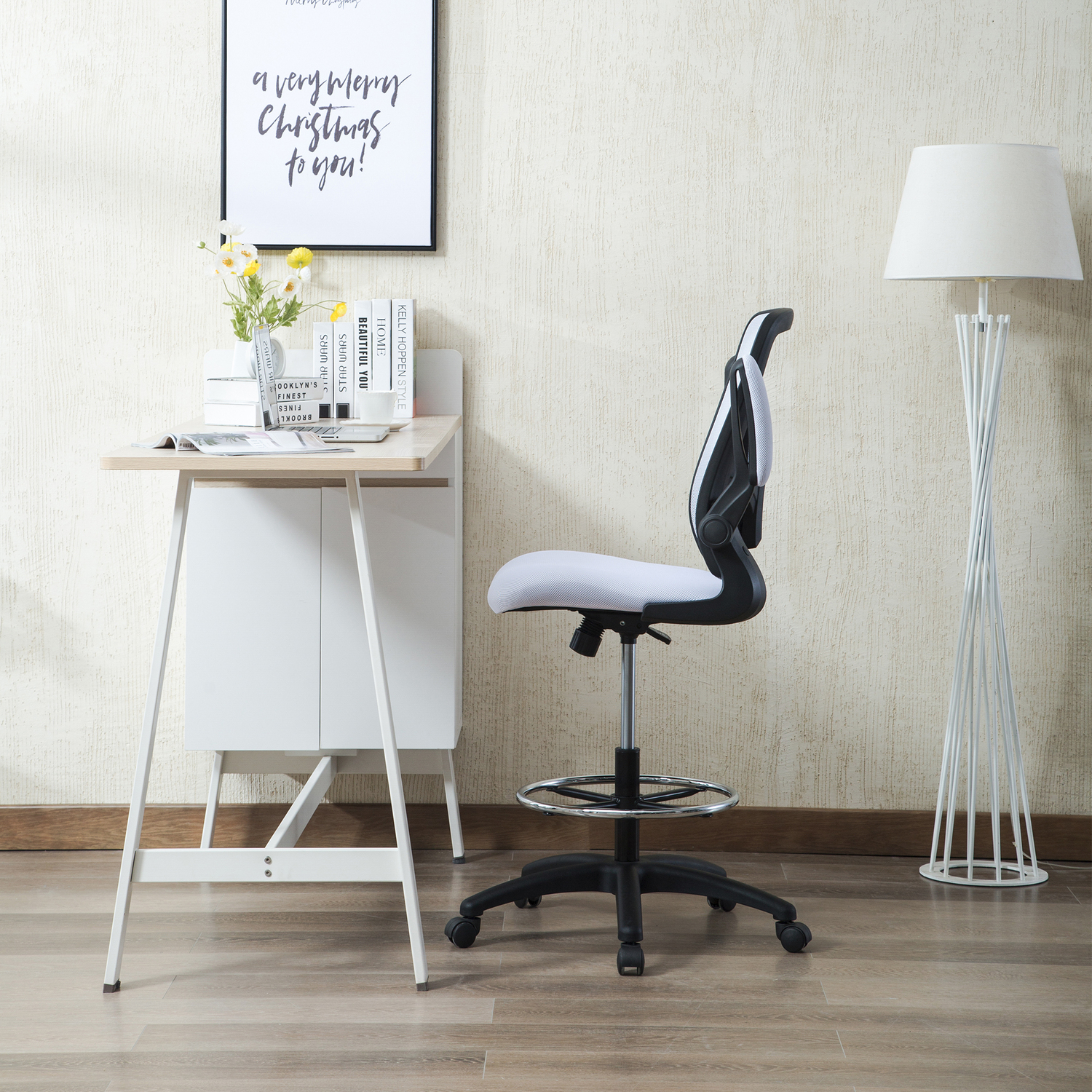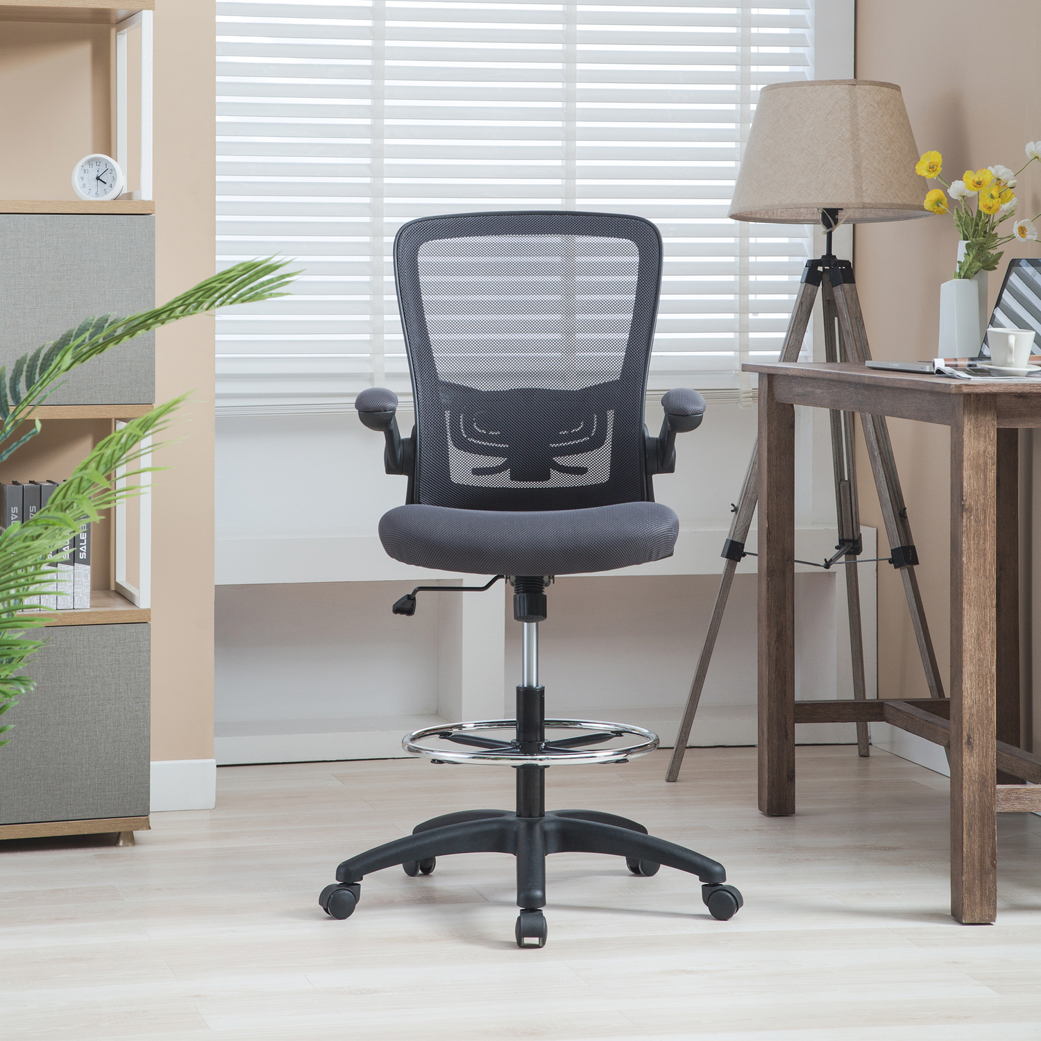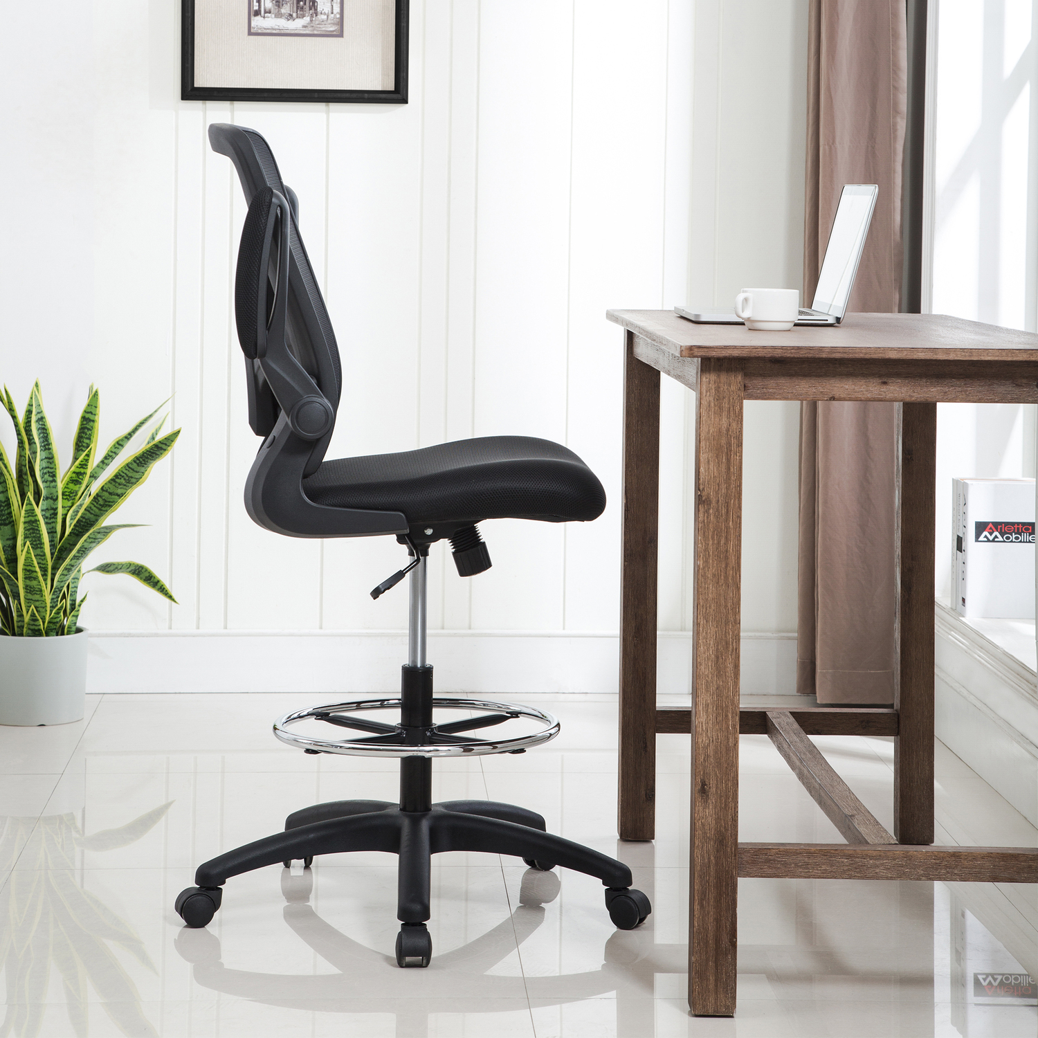 Add this Homestock high back office chair to your workspace. Great for those who sit for extended periods of time, built-in lumbar support follows the natural curve of your spine and relieves pressure on your lower back, reducing back pain. An adjustable height and flip-up armrests let you customize the placement for better shoulder and neck support, and an adjustable foot ring helps reduce pressure on your legs and improve circulation. A breathable mesh back brings more comfort. For easy moving, it comes with twin smooth-rolling wheels. Backed by a 90-day manufacturer’s warranty.
